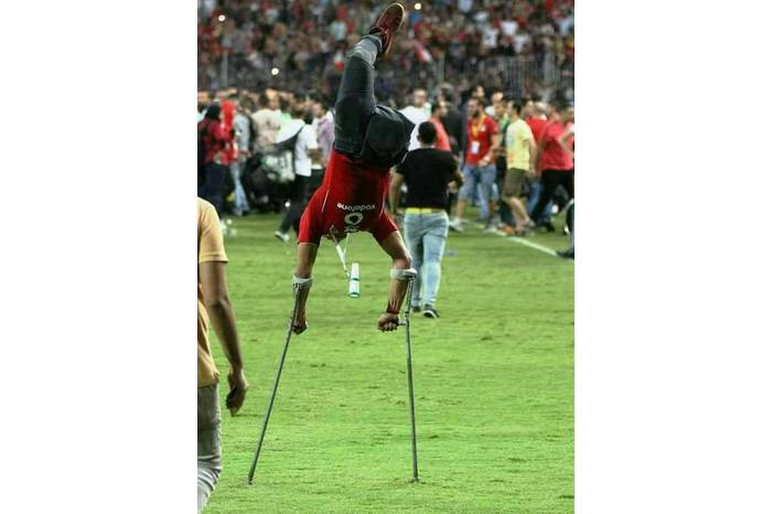 الصورة التقطت للشاب المعاق عقب انتهاء مباراة المنتخب المصري مع نظيره الكونغولي مساء أول أمس من تحت المقصورة الرئيسية في استاد الجيش ببرج العرب، وفور إحراز محمد صلاح لهدف الفوز والصعود، لم يتمالك الشاب نفسه من الفرحة وفوجئت الجماهير به يجري فرحا وبمنتهى الرشاقة رغم أنه بساق واحدة ولا يقدر على السير إلا بعكازين، ثم طار في الهواء ونزل مرة أخرى بطريقة لا يقدر عليها الأصحاء أنفسهم، وفور تداولها هزت مشاعر المصريين وألهبت حماسهم.
