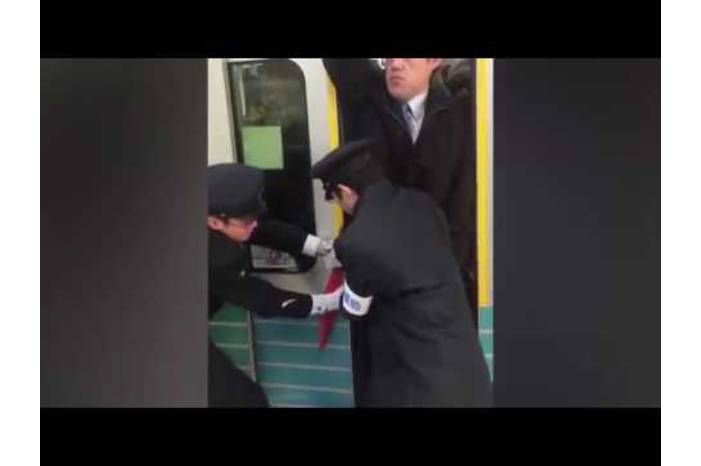 ففي الوقت الذي من المفترض أن ينطلق القطار وأن تغلق الأبواب، بقي رجال الشرطة بالمحطة يكابدون في حشر هذا الرجل للداخل لغلق الباب.