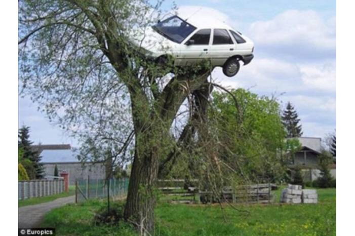 الوكيل - في بولندا قرر سكان احد الاحياء معاقبة شاب طائش يقود سيارته بشكل متهور ويسبب الازعاج الدائم واتفقوا على رفع السيارة ووضعها على قمة شجرة .. احد الجيران احضر الرافعة التي يمتلكها وقام تحت جنح الظلام برفع السيارة ووضعها على الشجرة .