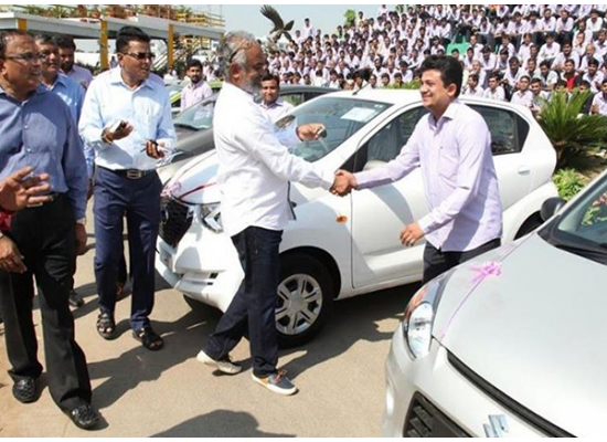 وحصل 600 موظف في شركة "هاري كريشنا إكسبورترز" لتجارة الألماس، التي يملكها الملياردير سافجي دهولاكيا على سيارات من إنتاج شركة ماروتي سوزوكي الهندية، كما حصل نحو ألف موظف آخرين على هدايا في شكل ودائع نقدية وشقق ضمن مراسم كبيرة أقيمت في الهواء الطلق بولاية جوجارات.